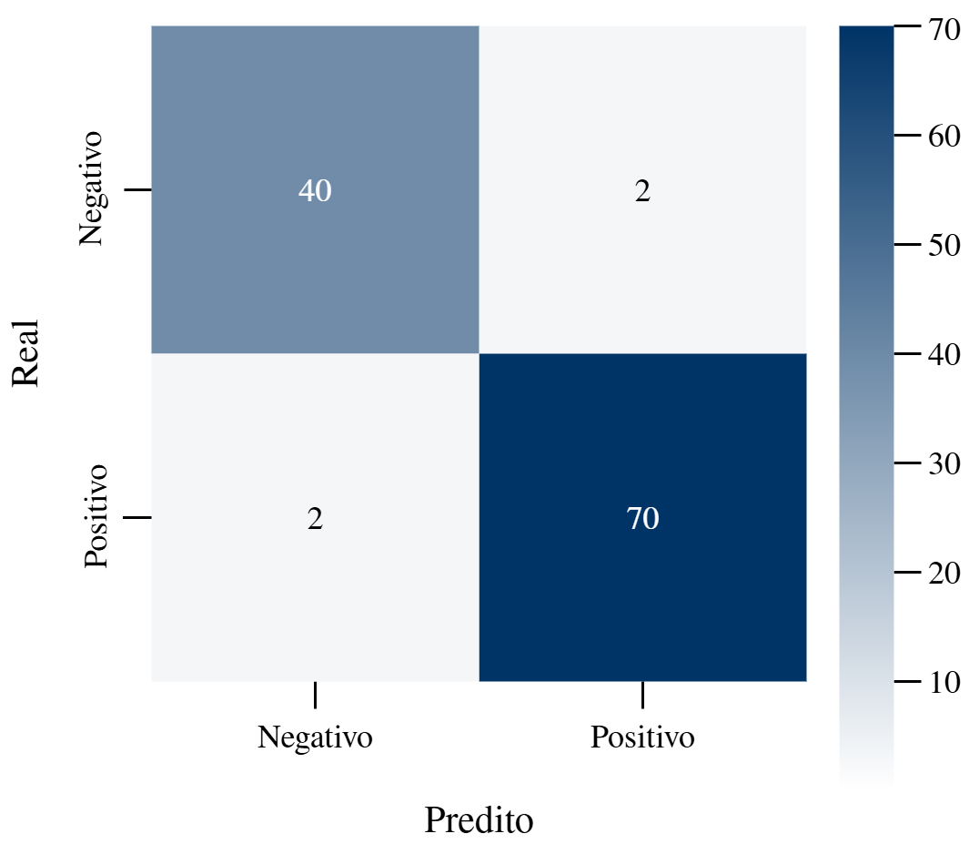 The model achieved excellent predictive performance, with accuracy above 96% and AUC-ROC of 99.34%, indicating high discriminative capacity. The F1-Score of 97.22% demonstrates balance between precision and sensitivity. The AUPRC of 99.58% confirms robust performance even considering different decision thresholds.