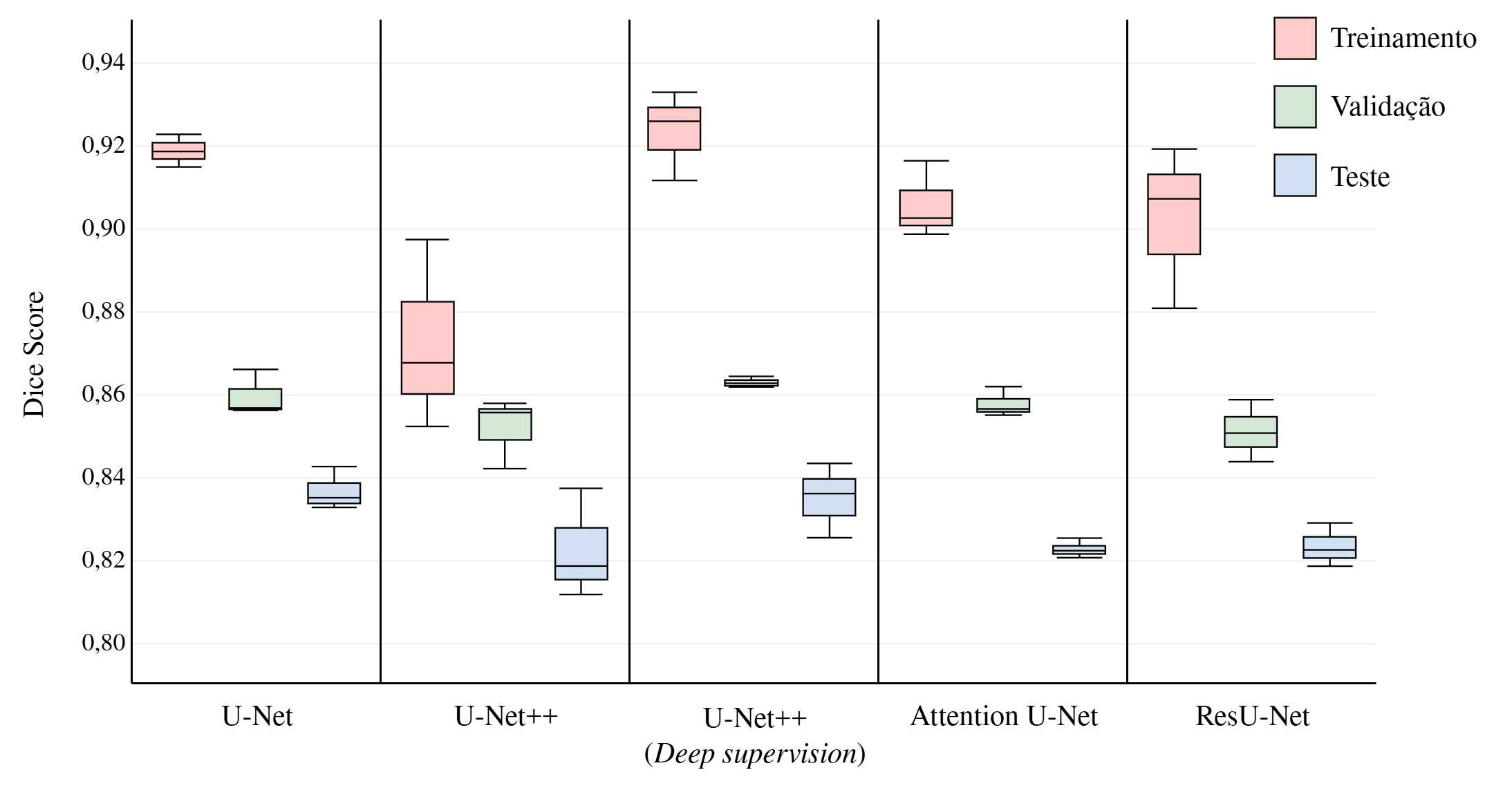 U-Net++ with deep supervision presents similar behavior, maintaining good consistency and reduced gap between validation and test. The multi-scale supervision strategy effectively contributes to training stabilization, resulting in elevated sensitivity without significantly sacrificing other metrics. ResU-Net exhibits intermediate variability, with residual connections providing stable training but without decisive advantages in final performance.